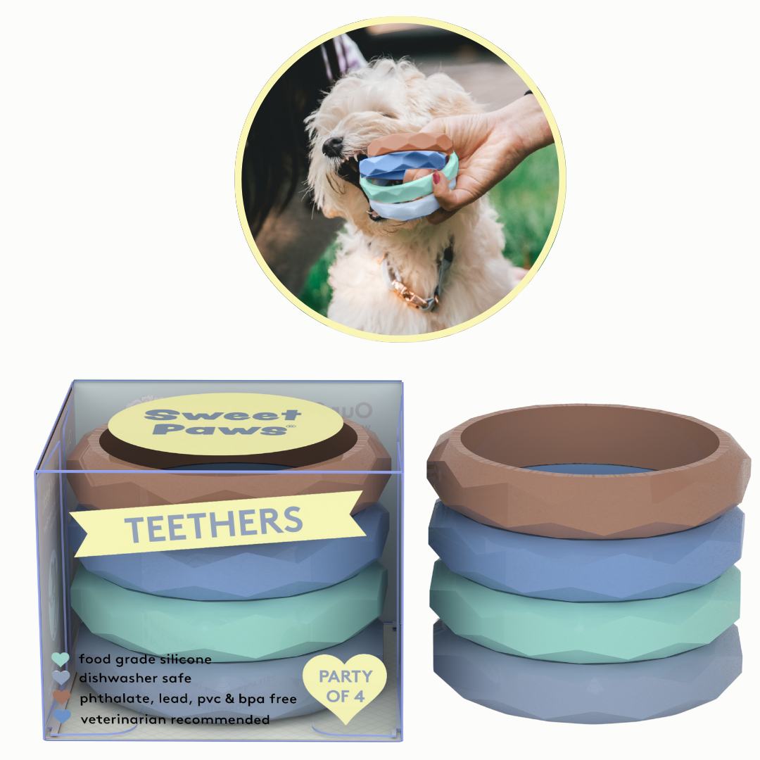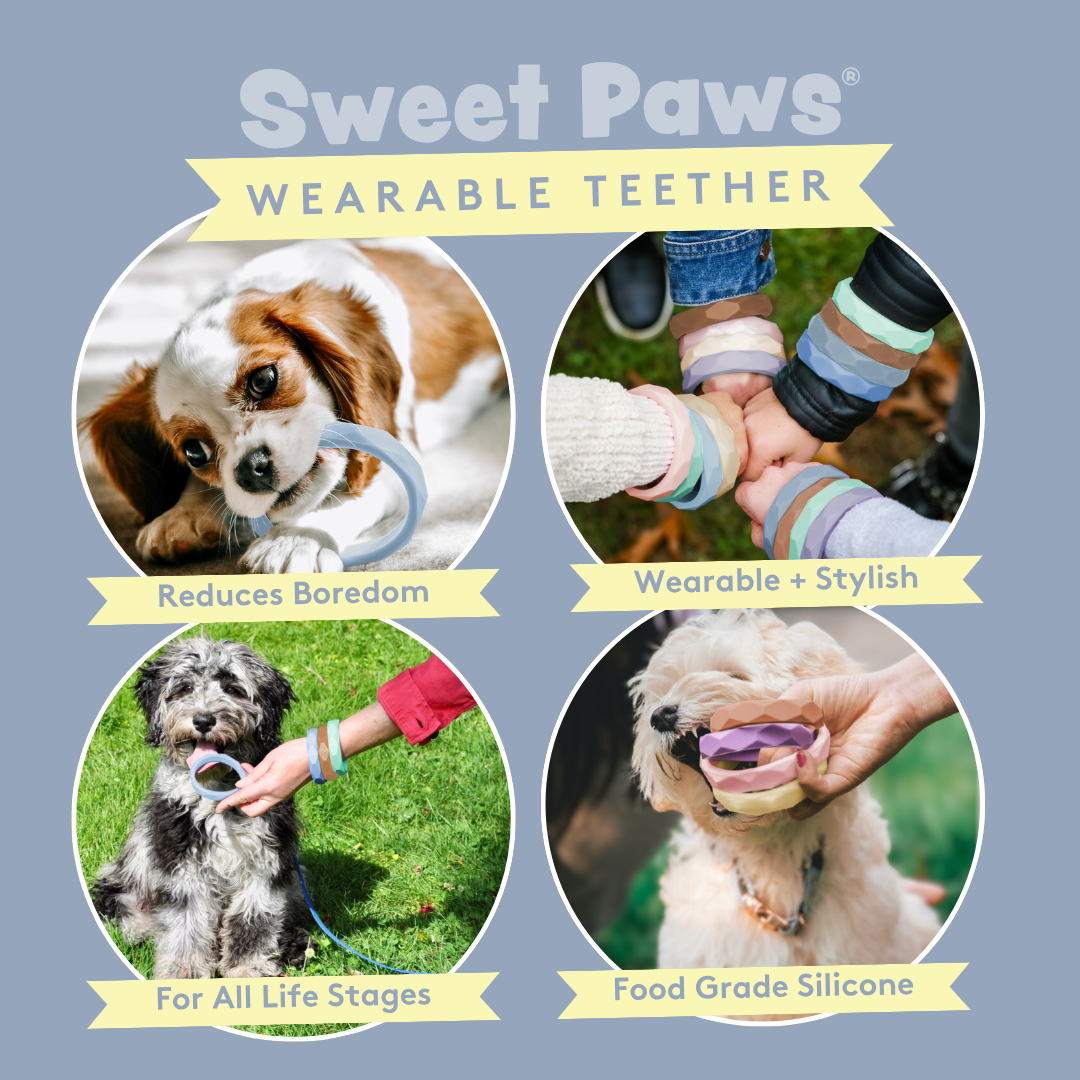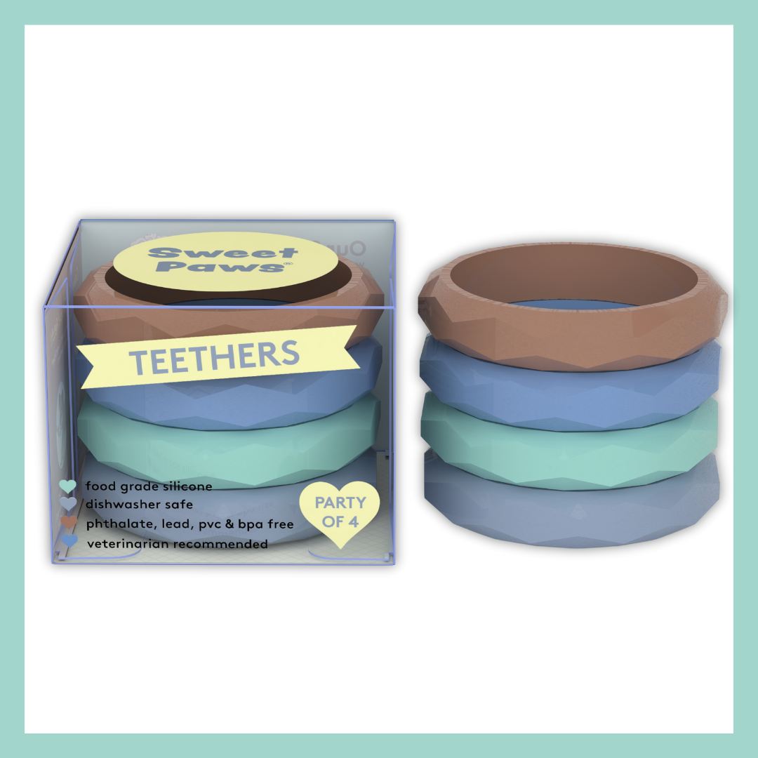 Wear it as a bracelet and always have a teething toy ready when your puppy or kitten comes nipping! Perfect for teething puppies and kittens, this non-toxic silicone teether helps encourage healthy chewing habits. Our teether minimizes boredom, fights destructive chewing and satisfies your puppy’s natural urges to play & chew. Our teether stacks come with four single teethers in one pack.