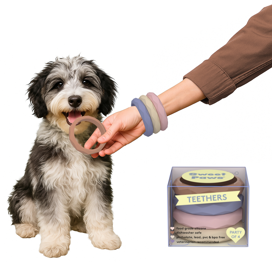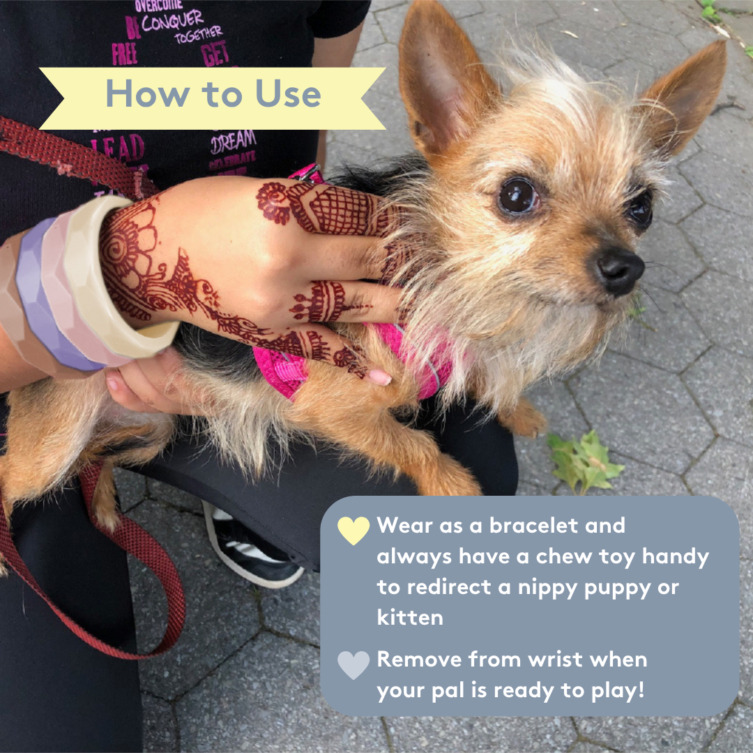 Wear it as a bracelet and always have a teething toy ready when your puppy or kitten comes nipping! Perfect for teething puppies and kittens, this non-toxic silicone teether helps encourage healthy chewing habits. Our teether minimizes boredom, fights destructive chewing and satisfies your puppy’s natural urges to play & chew. Our teether stacks come with four single teethers in one pack.