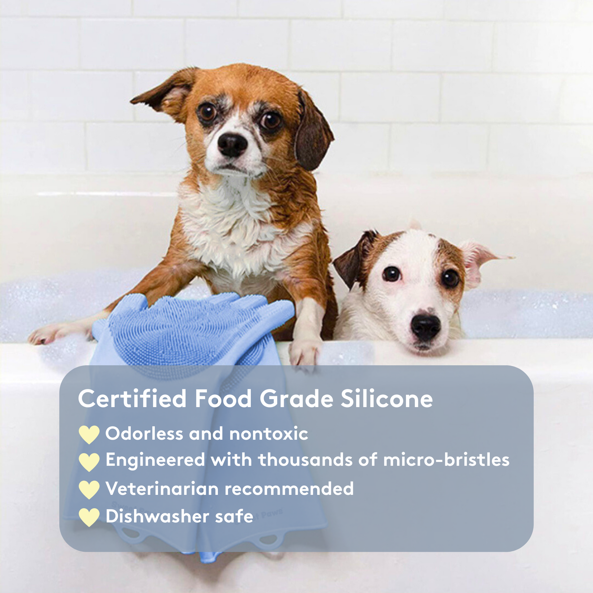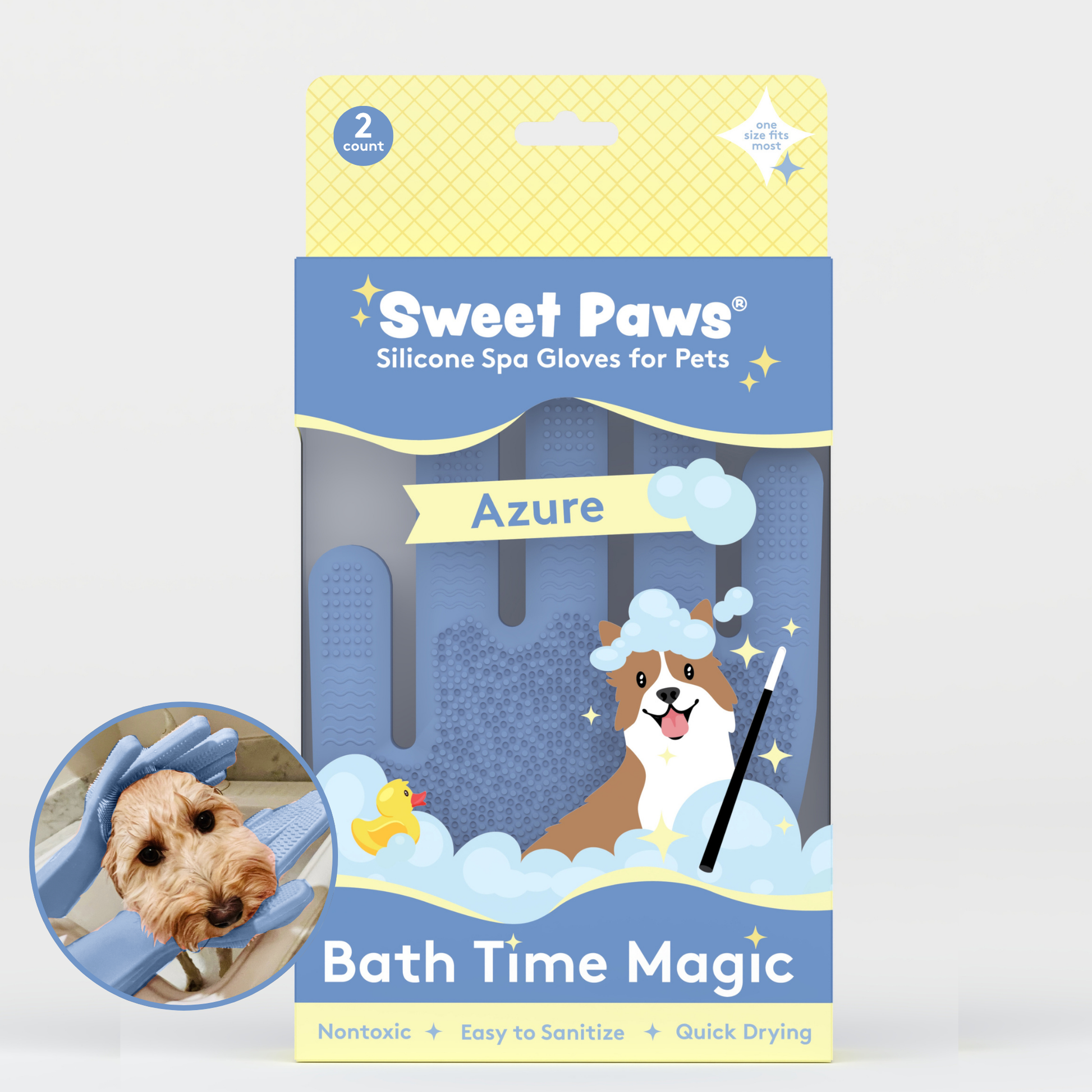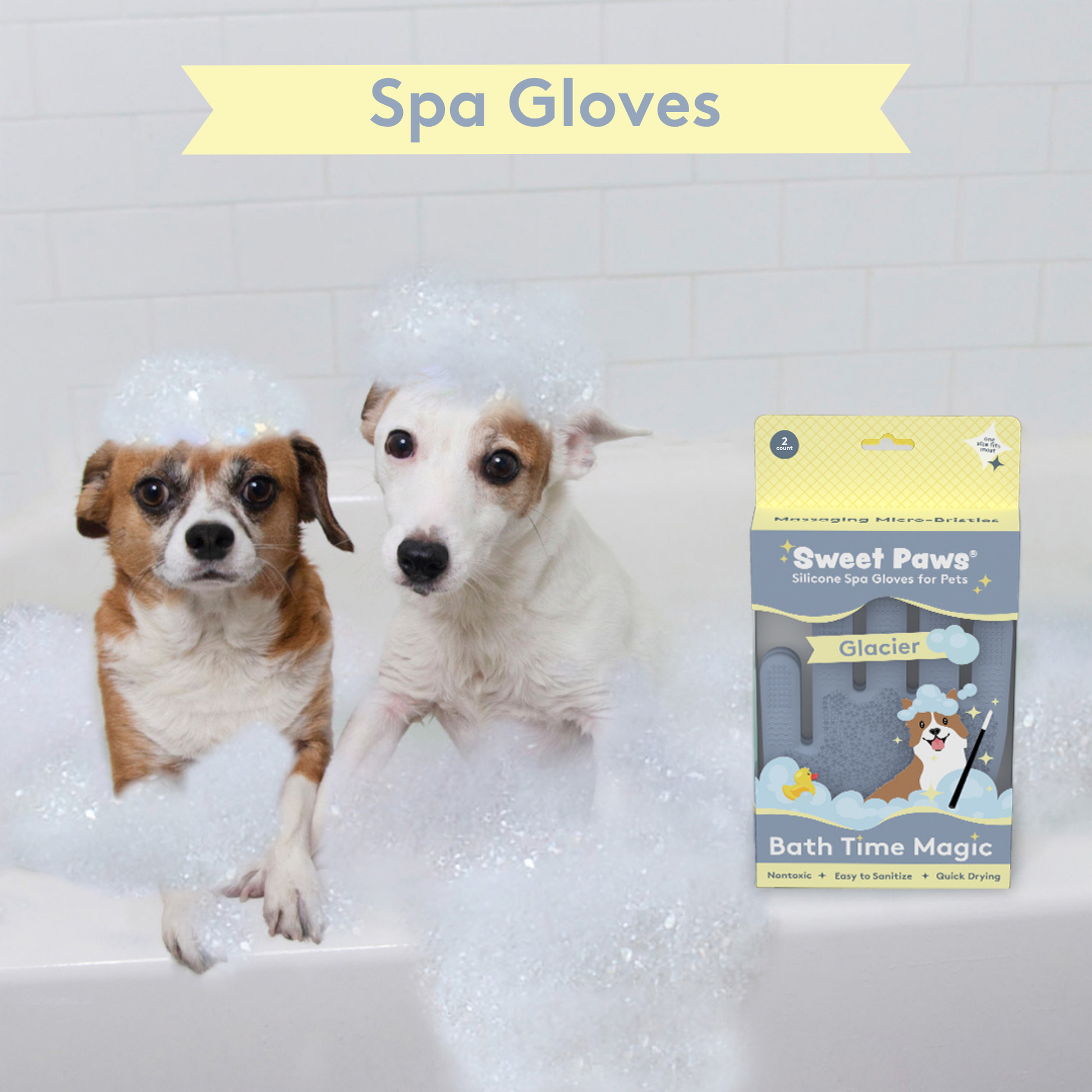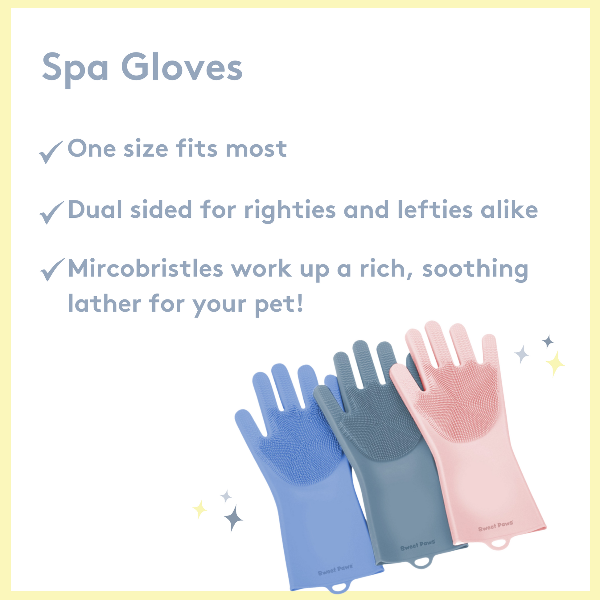 Pamper your pet with an s-paw day with Sweet Paws Silicone Spa Dog & Cat Grooming Gloves! They are designed to protect your hands while you massage your furry friend or scrub away dirt and grime during bath time. Not only do they protect your hands, but they also help leave your pet's coat fresh and clean!  Double-sided to fit righties and lefties alike.