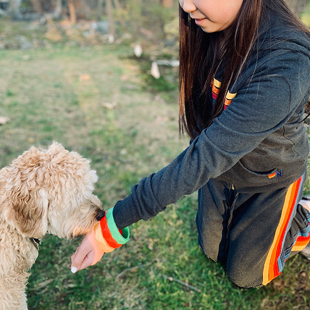 Wear it as a bracelet and always have a teething toy ready when your puppy comes nipping!